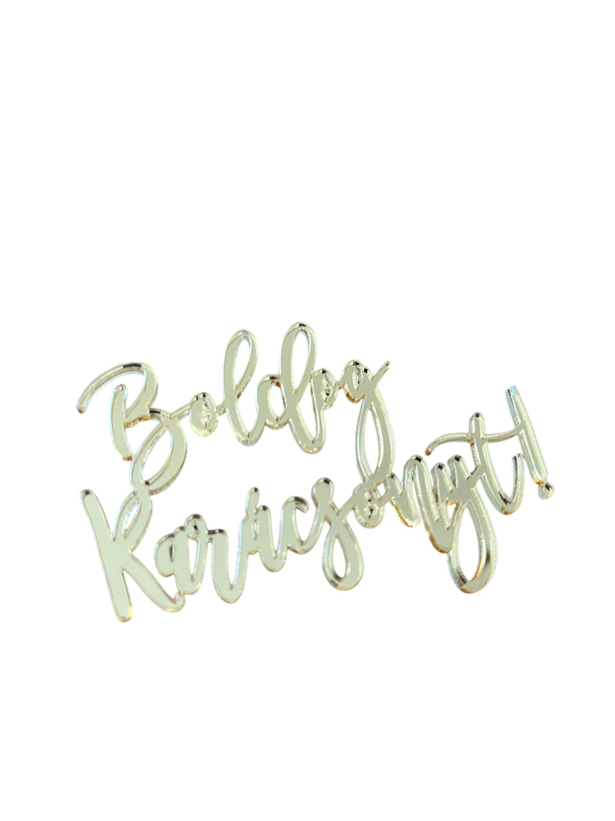 Text decorativ „Boldog Karácsonyt” (în limba maghiară, însemnând Crăciun Fericit) realizat din plexiglass auriu / argintie lucios, ideal pentru a adăuga o notă elegantă și festivă decorului de sărbători.